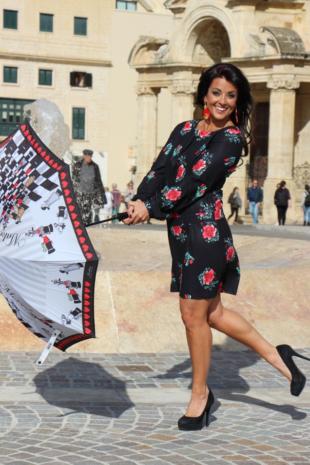 Just for fun, because it was a sunny day and it matched the red and black outfit perfectly, I had a little fun with this pretty Moschino umbrella, singing in the Maltese sun and dancing like nobody’s watching in front of Auberge de Castille.