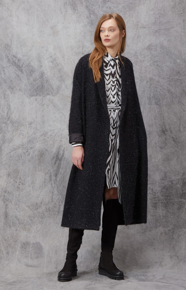 For all in black realised models, Antonelli Firenze chooses fluid fabrics, filled with light, shiny silks and zebra stripes in black/white. To wear using pony-effect velvet coats in cotton/viscose, or wool/lurex like a knitted cardigan.