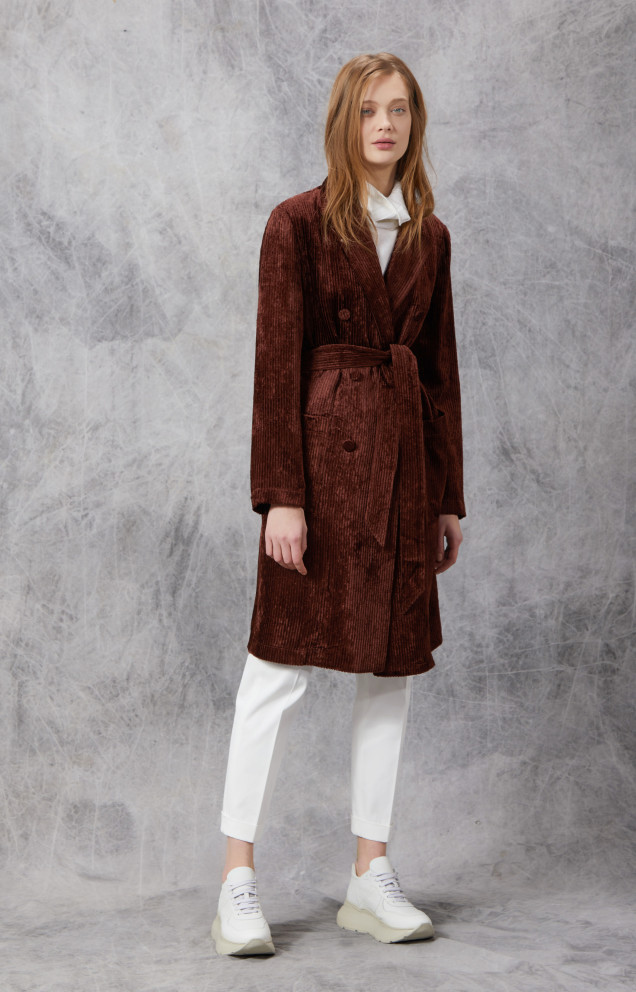 The blazers, like a sort of dressing gown, and the deconstructed coats fall down like knitted pieces; fluid pants go with the body movements, in light corduroy, while those with high waist are thought to be completed with light blouses to put into them; the pleated skirts in bronze and platin dance together.