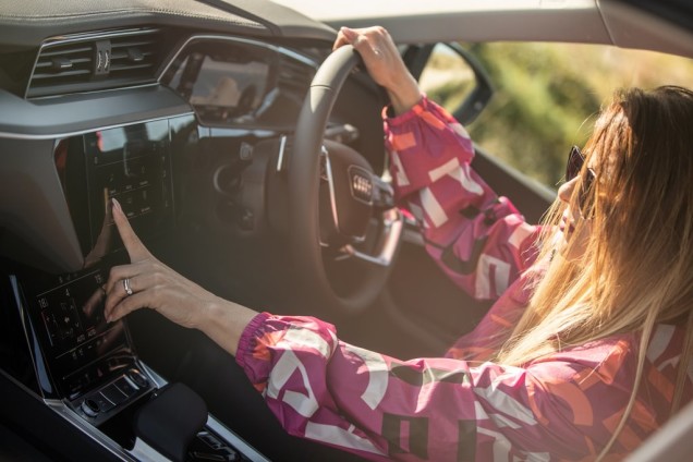 Audi’s Virtual Cockpit can be tweaked to your preference, too, so you can have your nav right in front of you if you choose. The centre console has a touchscreen for infotainment and nav duties, and just below is a screen dedicated to air con and such. The nav display also shows a big blue pool around your current location, marking the out limit of your range so you know where you might need to stop. It’s all slick and lag free, offering a pleasing haptic buzz to let you know when you’ve pressed a button.