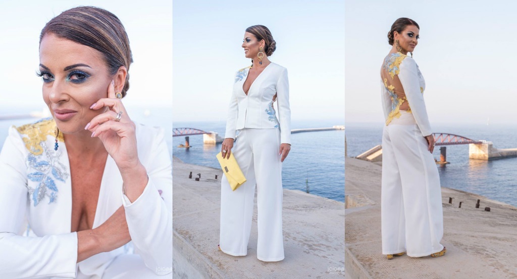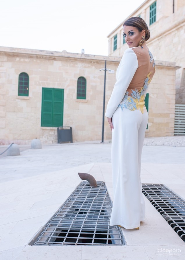 The photos shot by Justin clearly show the fabrics and the neat workmanship of this piece and I felt great wearing trousers. I will wear them more often after this! The lace detailing at the rear and the arm gave it that unique touch making it a striking piece, ideal for fashion week and any important event or occasion in the summer or winter months. I am one of those blessed with a sun kissed glow type of complexion all year round, thanks to my parent’s Italian/ Maltese genes, so I can pull off wearing white any time of year, which is great.