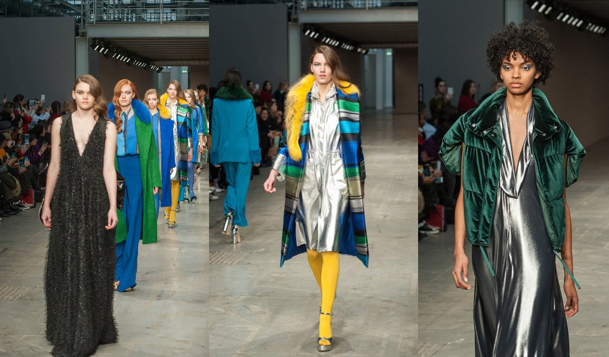 We saw various designs including long maxi dresses, trousers, mini dresses complemented and styled with jackets or coats in contrasting fabrics. We saw unexpected details inspired by the 70s and 80s and the Disco concept which gives his looks that urban yet chic feeling.