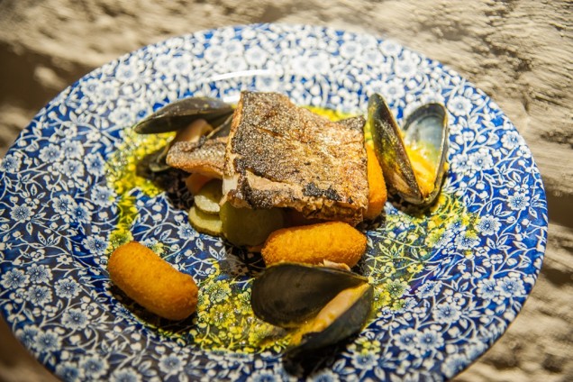 • Char Grilled Seabass served with curry and coconut mussel cream pickled vegetables and potato croquet.