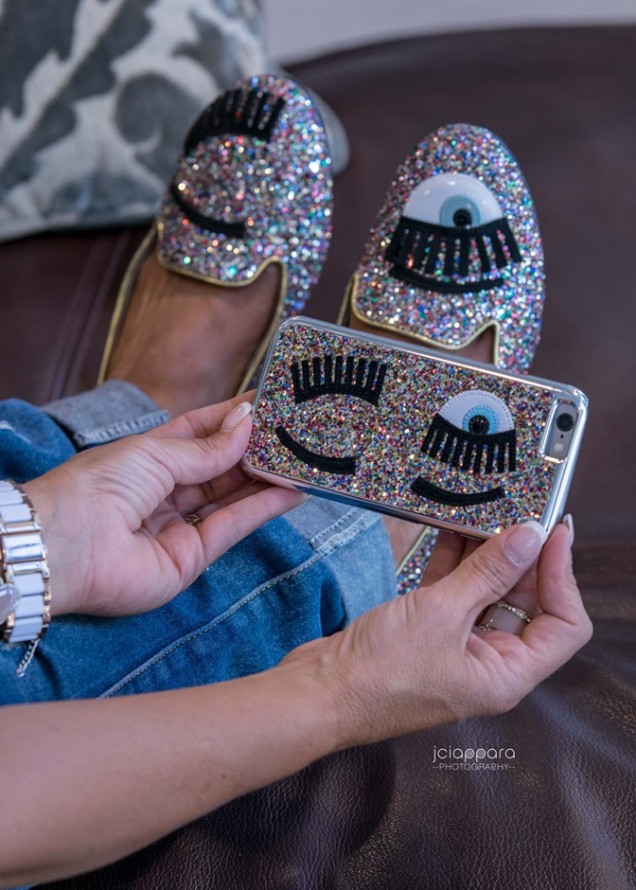 From the newly launched Chiara Ferragni range in store, have a look at these pink flats and matching iphone 6 wink cases from the “Flirting” collection, the leather ruck sack that stole my heart , the dark blue slip-on sneakers and matching ruck sack and my new babies – these high-heeled blue “Flirting” pumps. Jeans and very comfortable Ferragni casual sweaters.