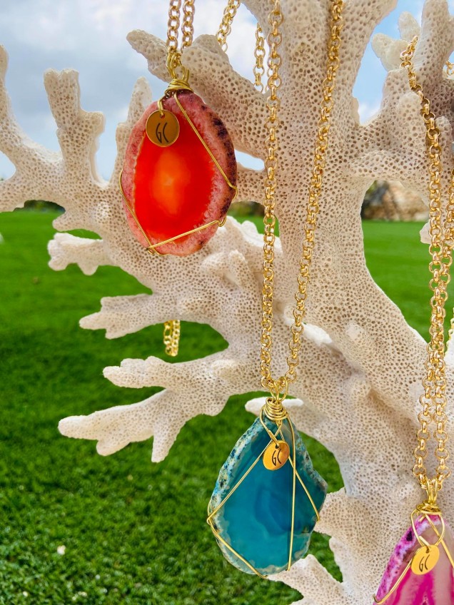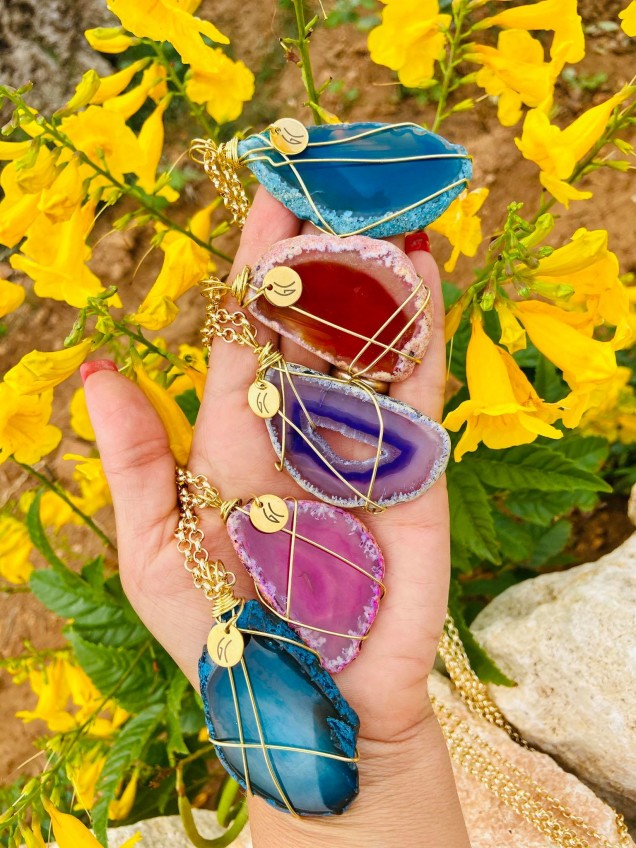Apart from being lovely ornaments to wear stylishy with any outfit this season, these pendants are made with high quality agate slices and wrapped in gold-coloured copper, and thus providing a lovely energetic gift too.