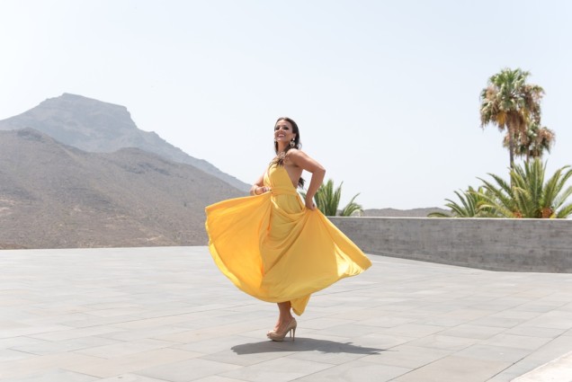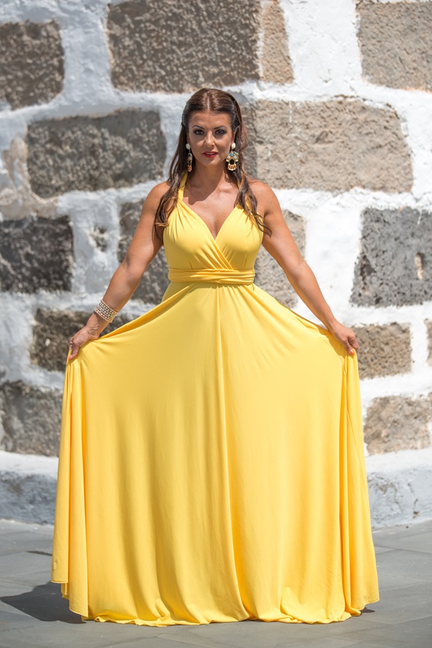 In this fashion blog, I’m very happy to share with you this gorgeous yellow maxi dress which can be worn in about 6 different ways. Here I managed to find 3 ways, the ones I could remember and I had photo taken by the fabulous Mark Thornton in 3 different locations in the Canary Islands to show you the variety of the dress and the beautiful destination!