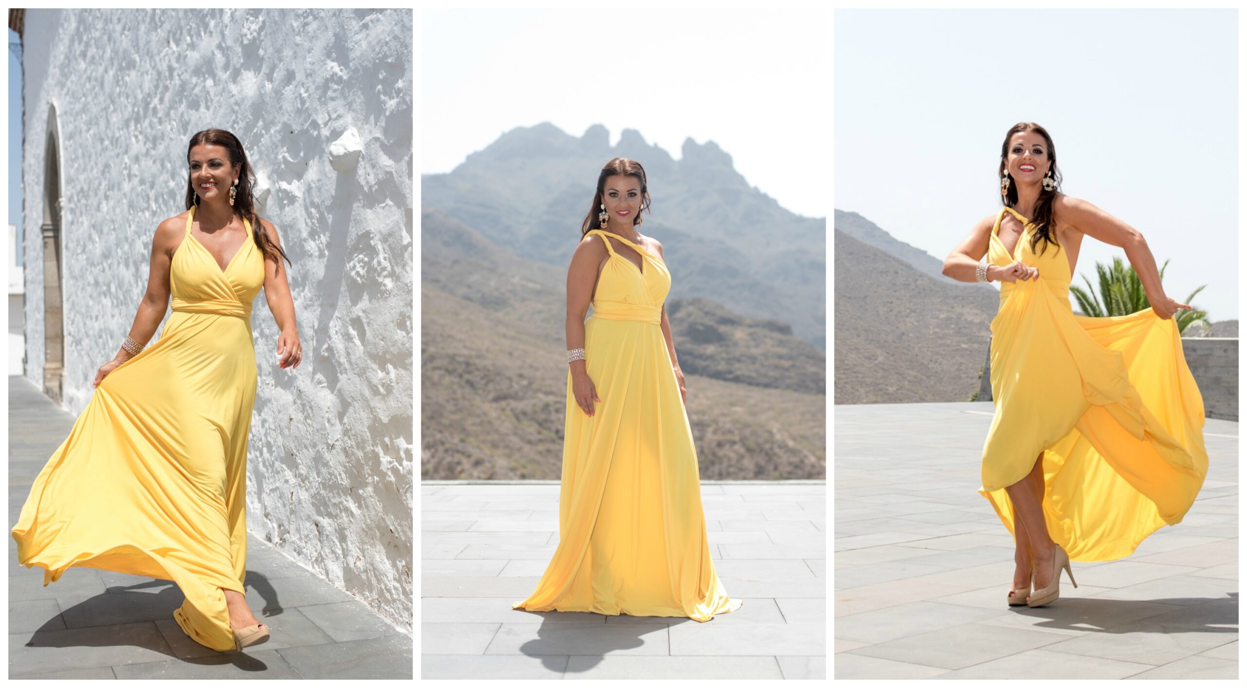 In this fashion blog, I’m very happy to share with you this gorgeous yellow maxi dress which can be worn in about 6 different ways. Here I managed to find 3 ways, the ones I could remember and I had photo taken by the fabulous Mark Thornton in 3 different locations in the Canary Islands to show you the variety of the dress and the beautiful destination!