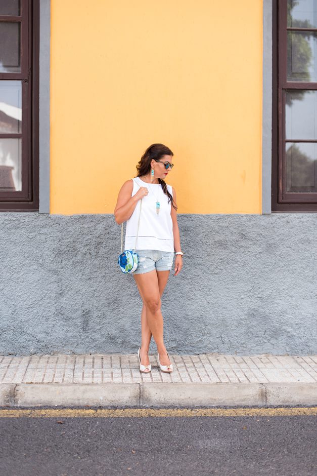 I wore a sleeveless white shirt from Mango’s latest collection, ripped Elisabetta Franchi denim shorts from Rebelli. For a Mediterranean fresh feel I went for blue coloured accessories so I wore this gorgeous set of earrings and matching necklace, a Tosca Blu bag, Michael Kors wedges and these gorgeous blue mirrored shades by Rayban .