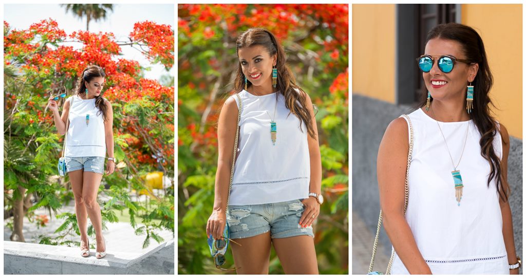 I wore a sleeveless white shirt from Mango’s latest collection, ripped Elisabetta Franchi denim shorts from Rebelli. For a Mediterranean fresh feel I went for blue coloured accessories so I wore this gorgeous set of earrings and matching necklace, a Tosca Blu bag, Michael Kors wedges and these gorgeous blue mirrored shades by Rayban .