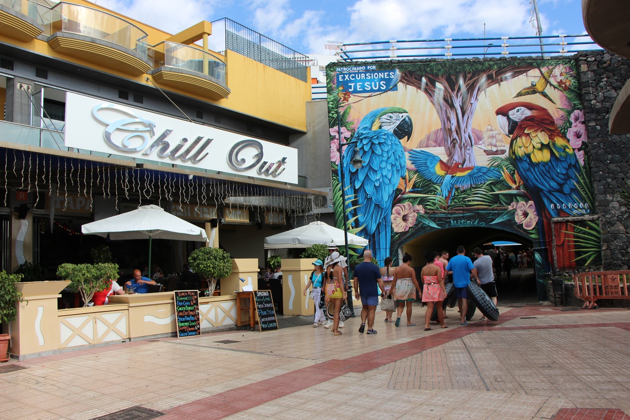 The Paseo Rincon del Puerto links the old and new areas of Los Cristianos and Las Vista in Tenerife so it is the perfect spot to praise the merits of Tenerife’s natural and cultural heritage. A colourful and visually pleasant series of giant murals have been splashed onto the walls of the tunnel entrance and on most walls leading to the Los Cristianos Harbour. They depict large dolphins and whales and turtles in very vivid and bright colours.