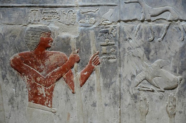 In the large sacrificial chamber, the reliefs on the north wall show Mereruka inspecting domestic animals; a boat building scene; and Mereruka carried in a litter with a large retinue, including two dwarfs leading dogs.
