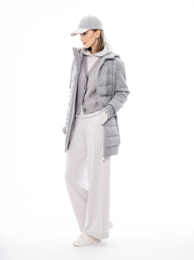 The extreme femininity of the Eleventy woman exudes even in the sportiest versions, such as the ones made of cloth with knitted inlays or with internal quilts. The precious suri alpaca version, with degrad design creates a sophisticated look.