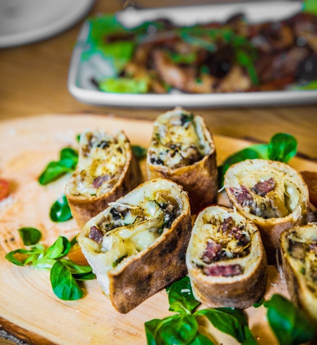 • Wild Boar Rotolo Rolled Pizza filled with mozzarella, mushrooms, wild boar sausage, caramelized onions & Parmesan cheese served sliced on a wooden platter