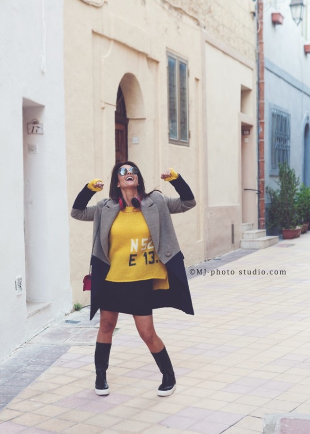 I chose this cosy yellow sweater and I paired it with a short black skirt, a grey three-quarter coat and these cute boots which I find adorable. Not to forget these colourful headphones to listen to music in my free time and this little bag to finish off the outfit. This look is such fun and so Benetton, with these vibrant layers and colours. Oh – these shades are also new faves and they are by Emporio Armani.