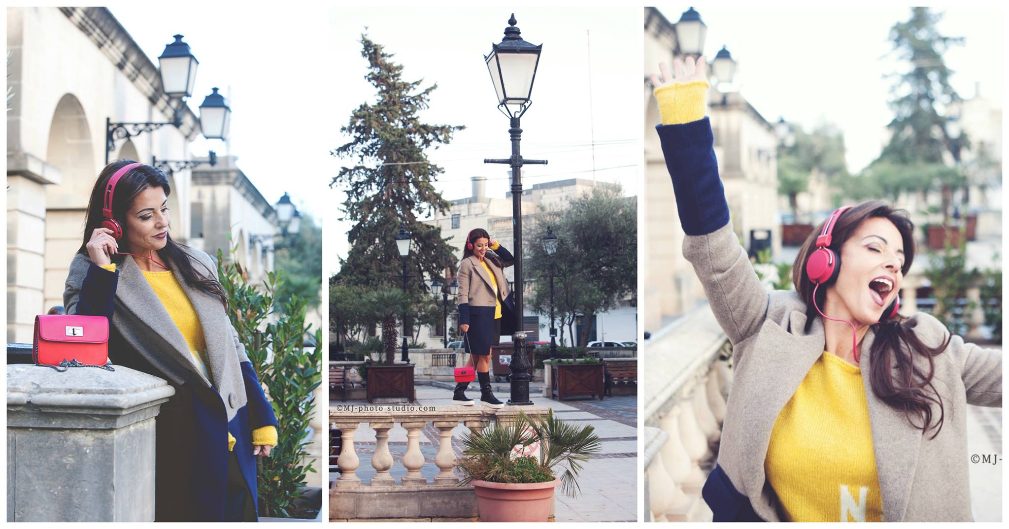 I chose this cosy yellow sweater and I paired it with a short black skirt, a grey three-quarter coat and these cute boots which I find adorable. Not to forget these colourful headphones to listen to music in my free time and this little bag to finish off the outfit. This look is such fun and so Benetton, with these vibrant layers and colours. Oh – these shades are also new faves and they are by Emporio Armani.