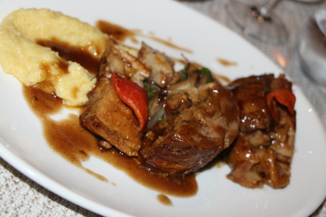 As main, accompanying our bottle of red Merlot wine, I ordered the slow-cooked braised pork belly stuffed with sundried tomatoes, rosemary and ricotta and popcorn polenta. Divine! My husband enjoyed the wagyu beef ribs served with fondant potatoes and red wine jus.