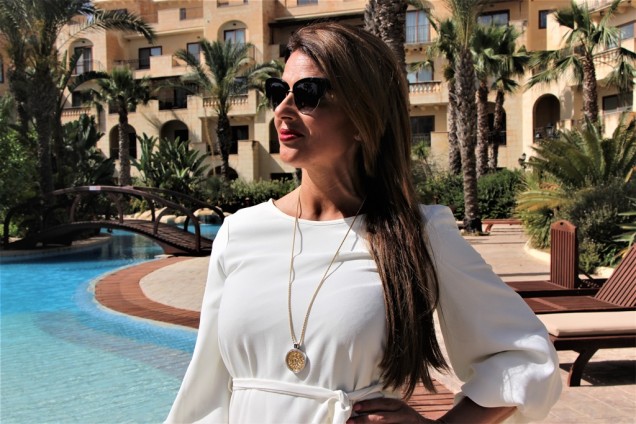 This young lady is an interior designer with a love for fashion and dance and therefore creativity and expression is in her blood. To get to know her better in a relaxed atmosphere and to be able to get a sneak preview of her creations in advance of Malta Fashion Week 2017, last week I treated this talented lady to a day in Gozo with me for a day at the 5 star Kempinski Hotel San Lawrenz. We attended the 120 years anniversary event together and of course we took the opportunity to photograph some looks to be able to share them with you a week prior to Fashion Week. Have a look at her designs and you will agree with me in saying that they are so pretty and quite easy to wear with current fashion trends including colourful summer prints, plain basics and casual denims