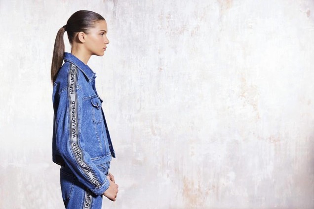 The men’s offering features jeans, outerwear and shirts. For a sharp look, there is a tailored jean jacket with matching skinny jeans — both in a silvery dark wash — plus button-down denim shirts in washes from light to dark. For weekend wear, there are relaxed fit bomber jackets with oversized logo branding, plus drawstring waist denim pants with KARL LAGERFELD ribbons running down the legs. Some statement-marking jeans feature an all-over print of the KARL silhouette logo.