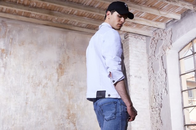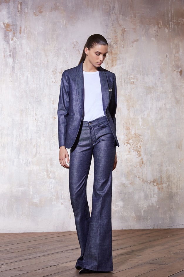 The women styles are offering features and variety of silhouettes including skinny, straight, boyfriend, flare and jogger fits. For elevated workwear, there is a dark wash denim suit with tailored trousers and a matching blazer. For a rock-chic look, there is a biker inspired moto jacket that can be paired with a jean skirt or skinnies. As warm weather arrives, there are also red denim shorts with a distinct Karl “signature” stitched into the hemline.