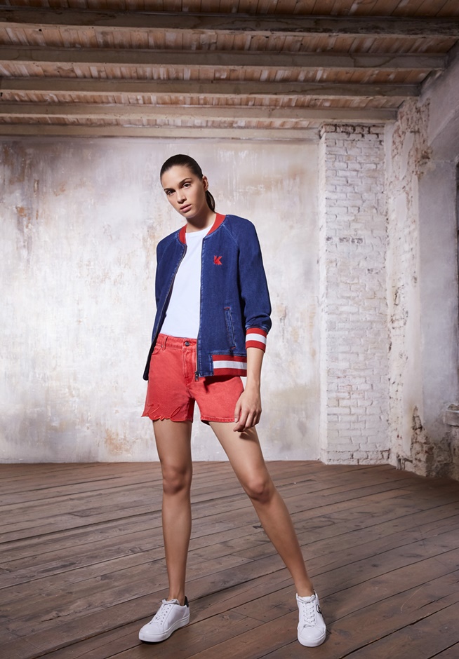 The women styles are offering features and variety of silhouettes including skinny, straight, boyfriend, flare and jogger fits. For elevated workwear, there is a dark wash denim suit with tailored trousers and a matching blazer. For a rock-chic look, there is a biker inspired moto jacket that can be paired with a jean skirt or skinnies. As warm weather arrives, there are also red denim shorts with a distinct Karl “signature” stitched into the hemline.