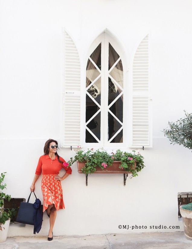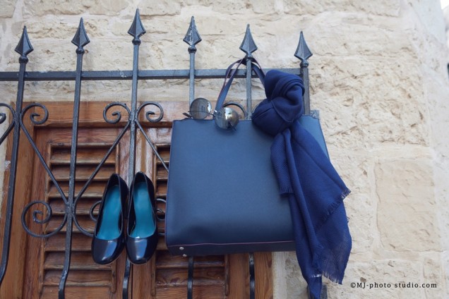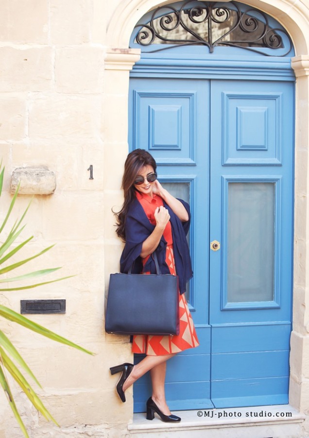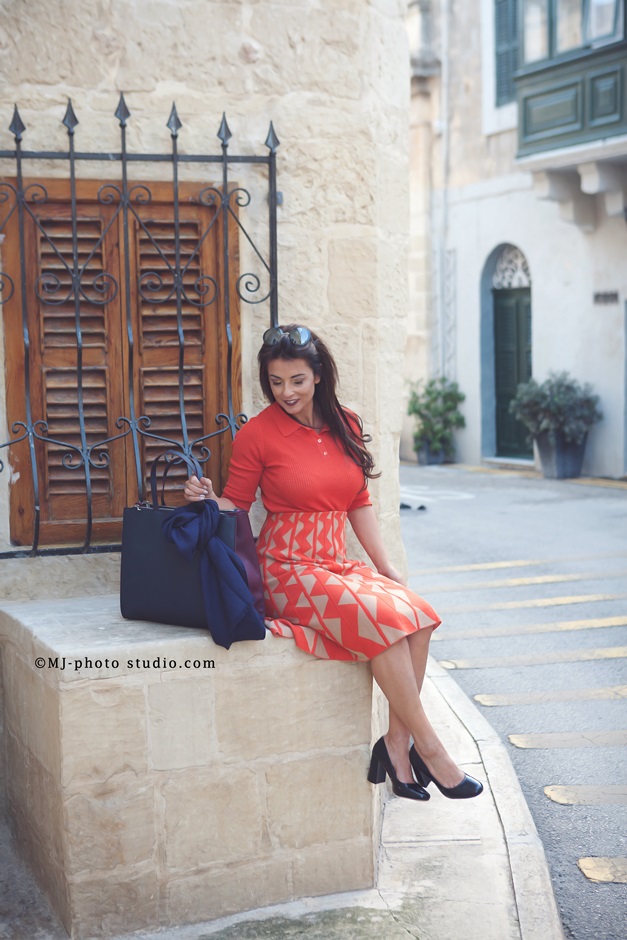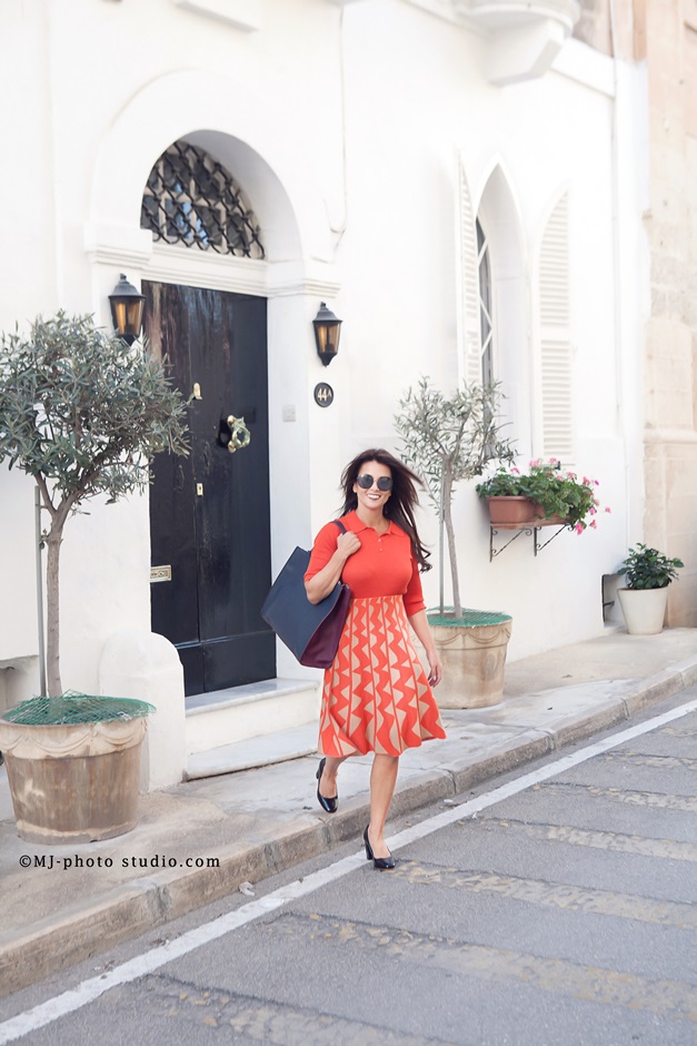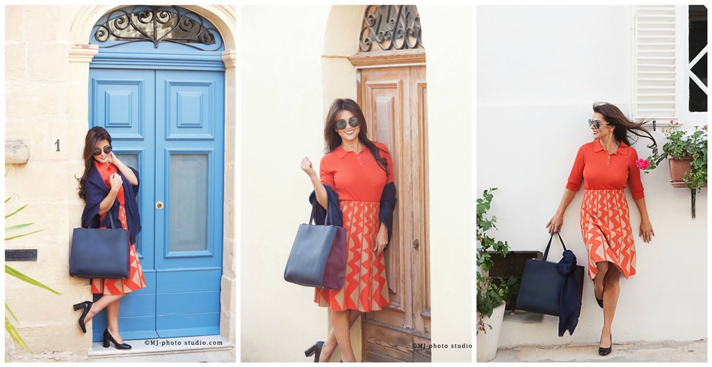 I decided to go for this warm orange polo shirt with this matching A-line three-quarter length skirt from the new collection at Benetton at the PAMA Shopping Complex in Mosta. I accessorised with dark blue accessories as a contrast including the leather shoes, the handbag, the scarf. To finish off the look – these cool blue oval sunglasses by Giorgio Armani.