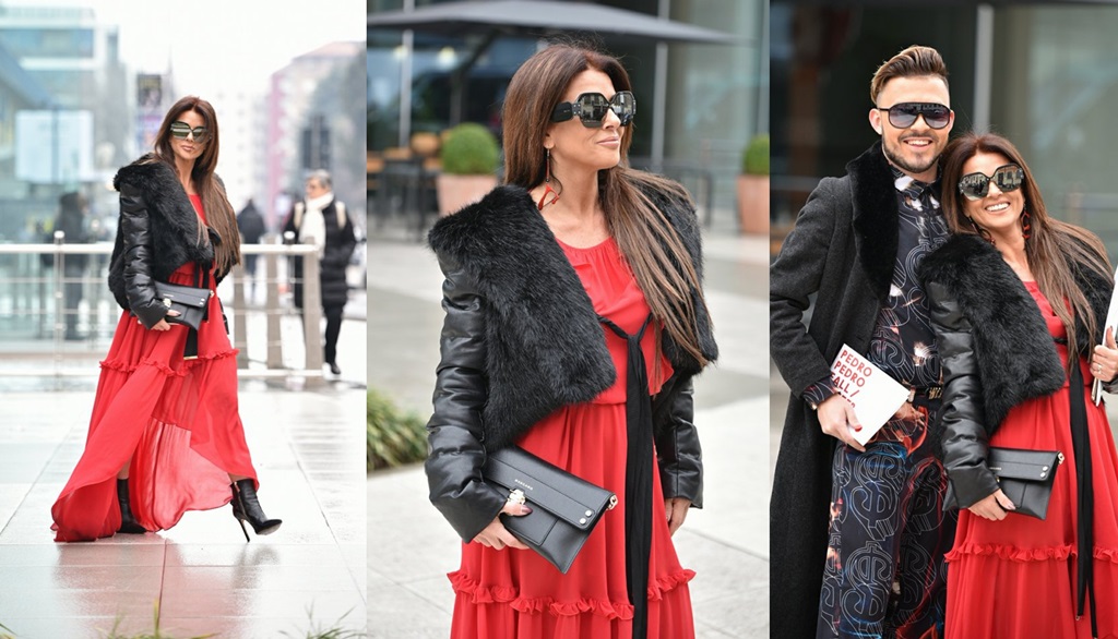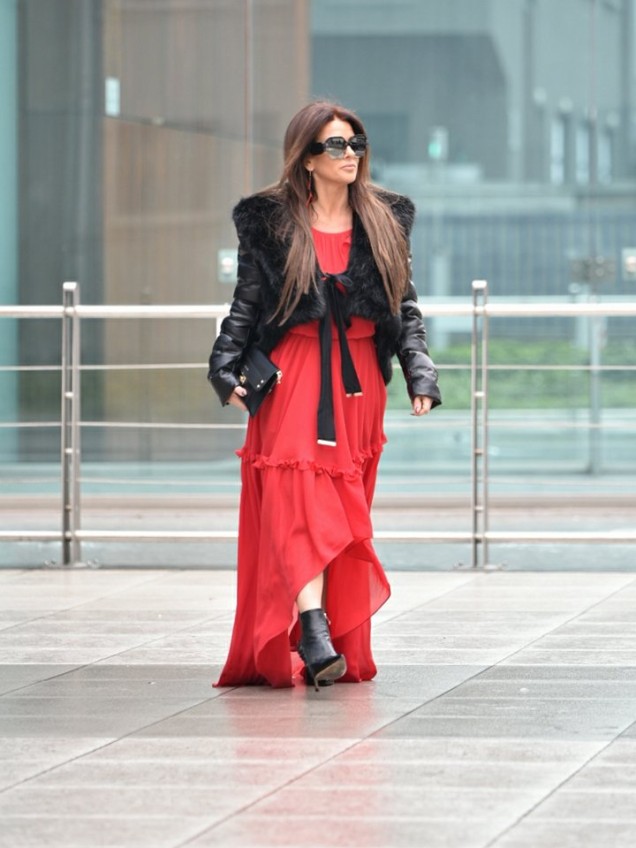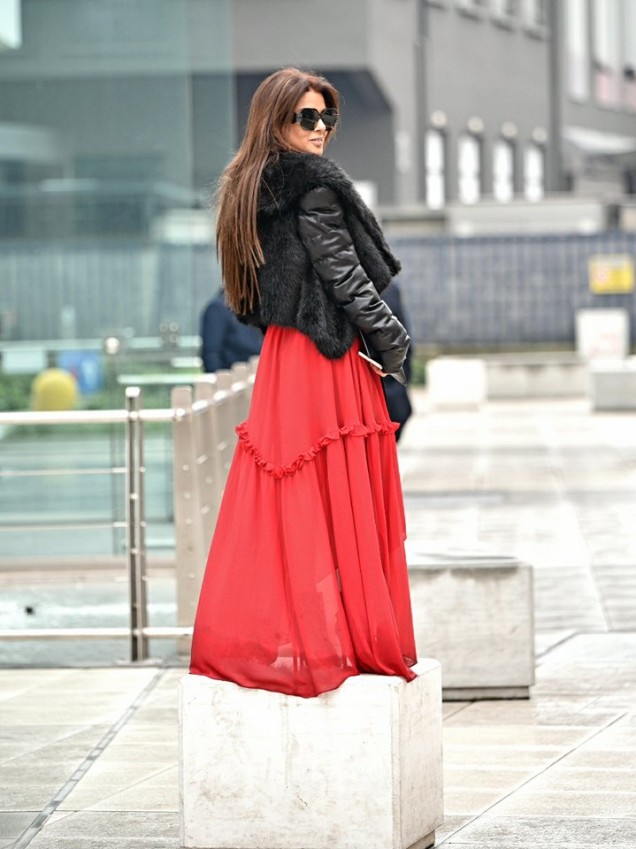 This was a full outfit by the Italian brand MANGANO including the purse and the shoes. I totally adore this red maxi dress which has a beautiful colour and design, a lovely flow and little frill details which give it a romantic feel. I decided to style it with a short black jacket and leather booties to give it an aggressive feel. To finish off the look I wore these new MIU MIU shades from Vision Opticians and black and blue customised earrings by Virag Design .