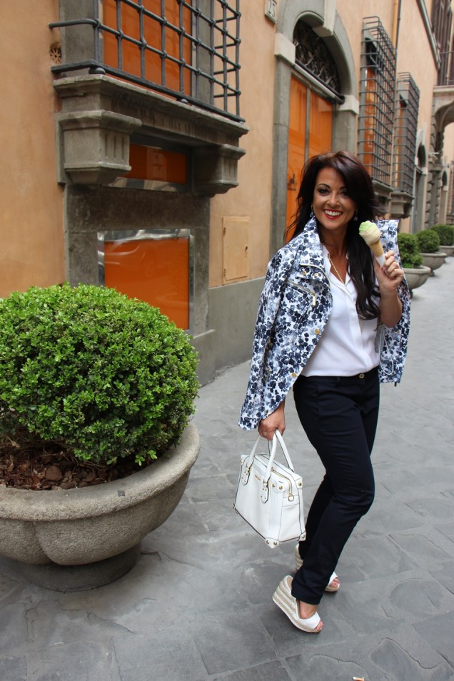 The Rebelli Team recommended the brand Michael Kors. We chose a chic look by mixing items from their spring/summer collection 2016. A white short sleeved silk shirt with gold trimmings, blue skinny trousers, the fabulous flower patterned jacket and to complete the look the Taryn bag and wedge shoes in white. This was it! I absolutely loved it and couldn’t wait to wear it!