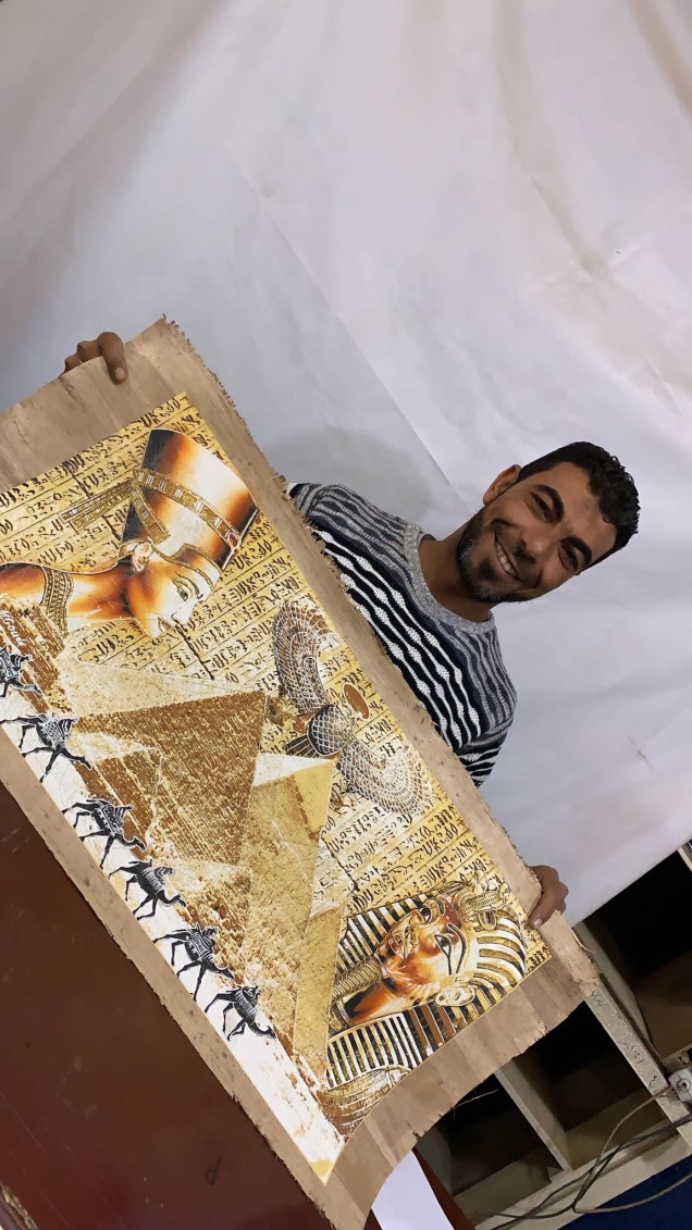 After one of our sightseeing tours to see the Giza Pyramids, Rami our tour guide took us to this famous local store that makes and sells papyrus paintings and the experience was very interesting – We learnt step by step how it is made. Papyrus began as the world’s first type of paper, derived from the Cyperus papyrus plant. Even though it was developed in Egypt, it spread across the ancient world and was used throughout West Asia. A variety of documents written on papyrus remain preserved to this day. The various documents contain a range of subjects, from biographies, to maps, religious texts and scientific or medical documents. Today you can find good quality papyrus in stores like this one where you can see how they still make it themselves.