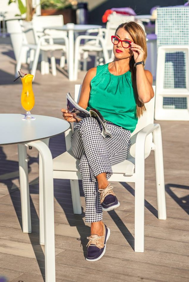 You will notice in this look, I am wearing a silky top and checked trousers from the new collection at Cortefiel, a Michael Kors bag and my new pair of Skechers. As you can see Im wearing my new sighted Dolce e Gabbana reading glasses, which I’m starting to get used to and love.