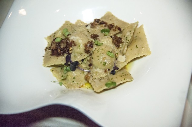 • Fresh mussel ravioli carbonara served with a guanciale vinaigrette