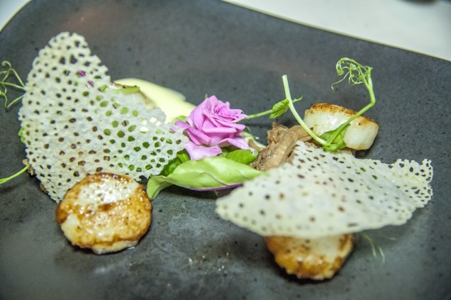 • Pan seared scallops, pulled pork, lotus crisp, smoky hollandaise sauce