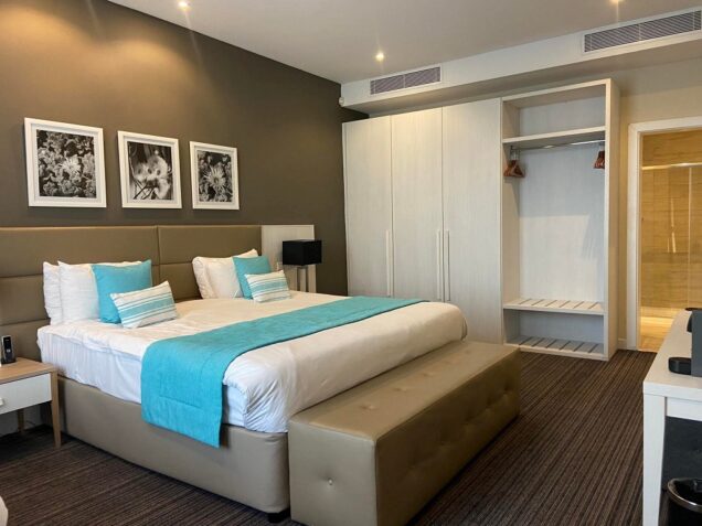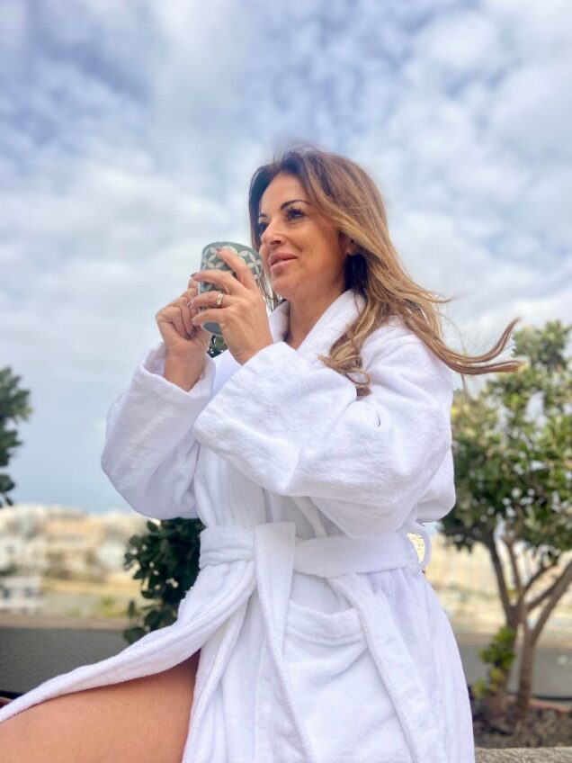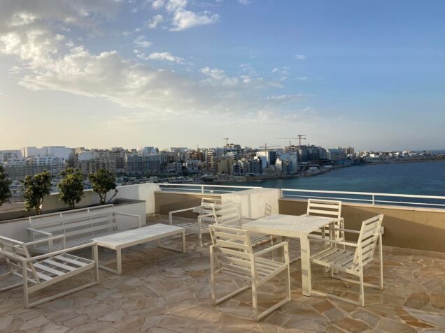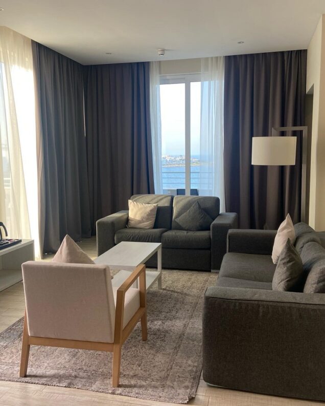 We were so excited to see the room. As many of you saw in my Instagram Stories @graziellecamilleri, the room is exquisite. Perched on the 5th Floor of this property nestled in a peaceful seafront location, it was a treat! A very large room with dimensions the size of a large apartment with its own private terrace overlooking the seafront.