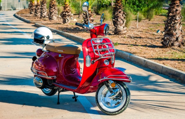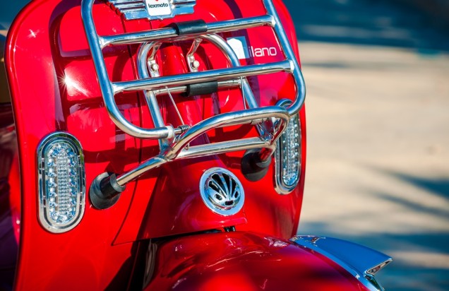 The scooter model I picked to show you is a Lexmoto Milano and it’s a 125 CC. it is so attractive and reminds me at first glance of the Italian Vespas you see roaming around in the Italian streets and this glossy red colour is just gorgeous. The classic styling is presented in a choice of 3 stylish colour options with a tan coloured seat to encapsulate that 60`s Mod style!