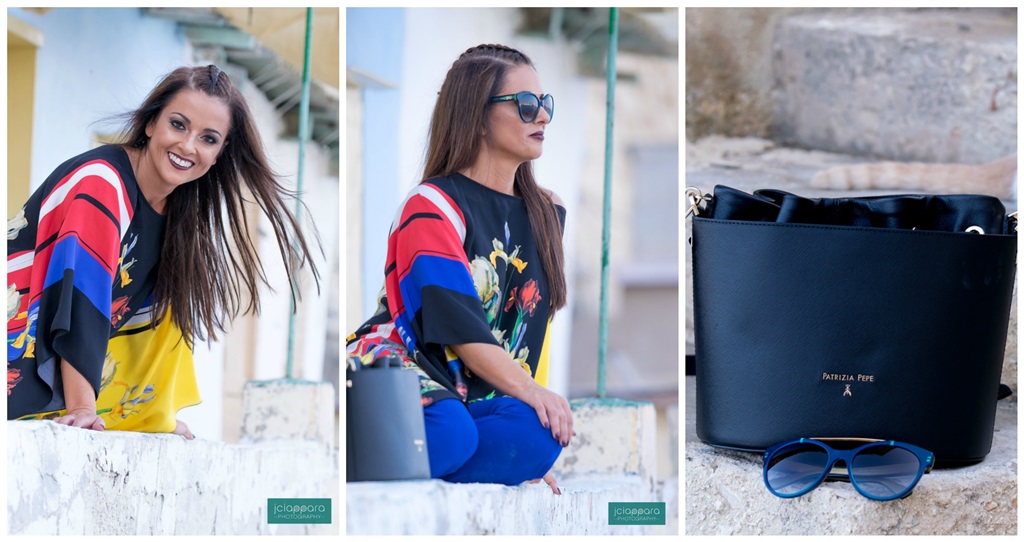 In this blog I wore this gorgeous Class Cavalli shirt and matching blue trousers and I paired them with a black leather Patrizia Pepe bag from SYL Boutique at the Plaza Shopping Complex in Sliema. It’s an outfit I’d wear to many events including Sunday lunches with family and friends. The colours are so beautiful!