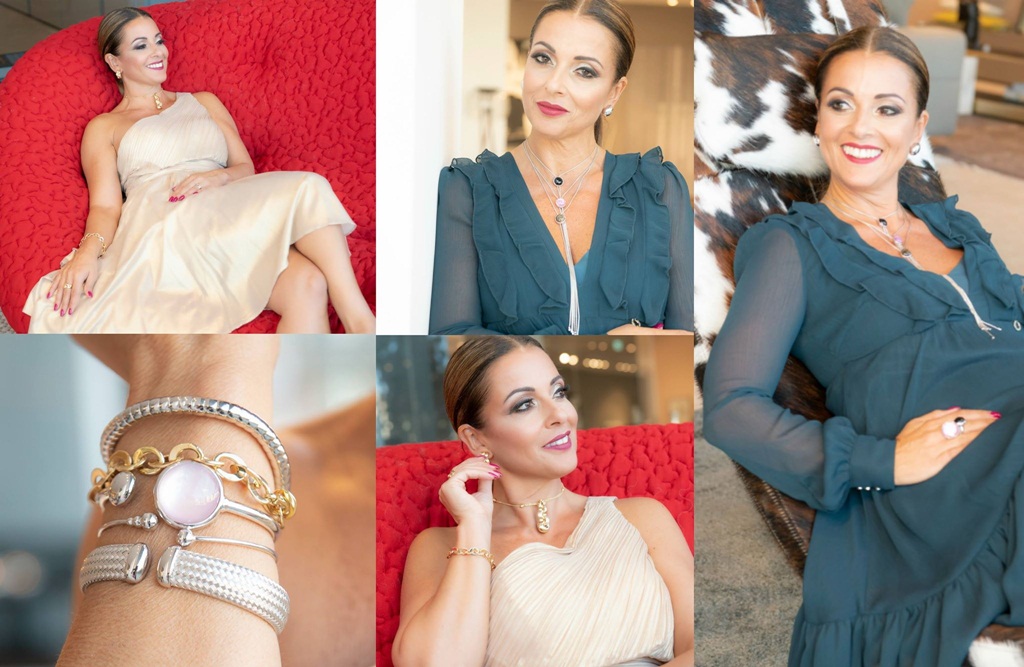 In this blog I would like to show you two looks, one is the way we styled this pale gold dress from Mangano with some stylish pieces from GABA and the other is a green dress also from Mangano which was styled by Sue Satariano by layering various jewellery pieces. Love the look!