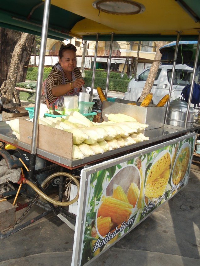 Eating fresh grilled corn with salted coconut cream was another idyllic snack in Thailand. For as little as 50 euro cents, we enjoyed this quick bite at the beach washed down with some fresh watermelon juice!