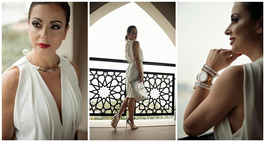 Here in Dubai, I wore the watch with this white Plein Sud dress from the Outlet, and paired it with silver shoes and purse from River Island. Hair was pulled back in a sleek ponytail to give a more sophisticated look. Makeup was aptly done for me by Jean Zammit, who focused on creating this look – dark eyes with a blend of various dark shades. Love the finished look. It was perfect for my dinner date at ZUMA in Dubai that night.