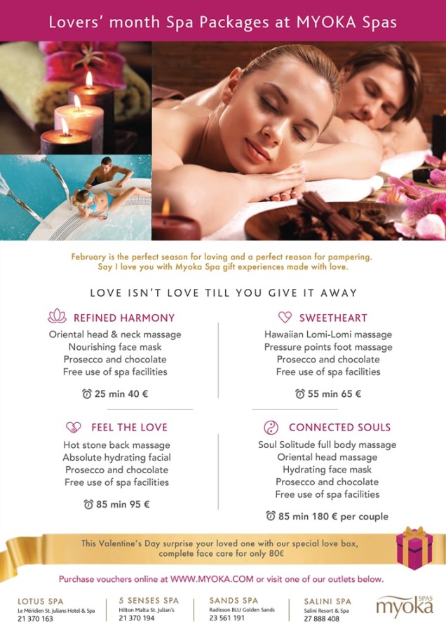 This couples spa package is just perfect for Valentine’s Day, to bring you closer together. You are physically relaxed – and as we know a relaxed body is a relaxed mind. Myoka have created specific packages for all the month of February 2016. Check them out here!