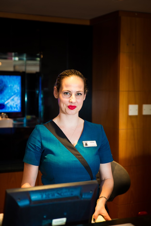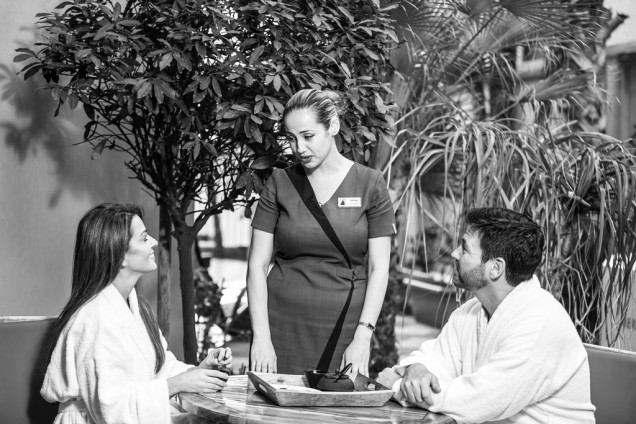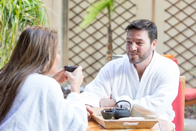 We started off by changing into comfortable clothing provided by the Spa – crisp white bath robes and slippers. Our treatment began with an invigorating cup of green tea and tasty chocolates in the serene outdoor garden with fresh plants and outdoor furniture and flowing water features to encourage relaxation and feelings of well-being. There was also an indoor area with several tables and chairs with red cushions, with other guests who were there sitting and relaxing before or after treatments. We were introduced to Sabina the Spa Manager, who welcomed us warmly and gave us a brief insight into what we were about to experience. We enjoyed this introduction very much.