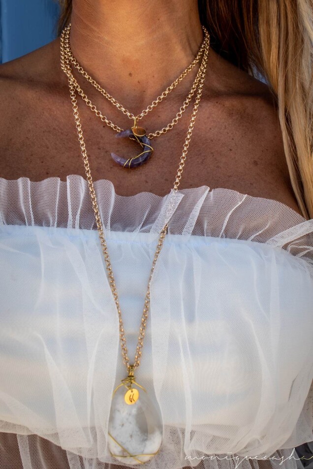 A great thing about my jewellery is that you can layer them very easily – Here we are showing a few examples of how to do it. Look great and feel empowered with the wonderful healing energy of these Crystals.