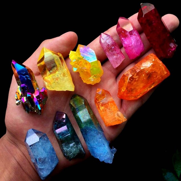 Clear Quartz, Milky Quartz, Amethyst, Rose Quartz, Quartz Geodes or other types of crystals are placed into a vacuum chamber and heated to over 800°C at which point a vapour of precious metal(s) is added which then coats the crystal and its atoms bond to the surface. This is a risky process and crystals with fracture lines do not survive. The coloured iridescent metallic sheen of the crystal and its new properties are defined by the precious metal that is used in the vapour. The most common elements to make Aura Crystals with are Gold, Platinum, Titanium, Silver, Iron, Magnesium, and Nickel.